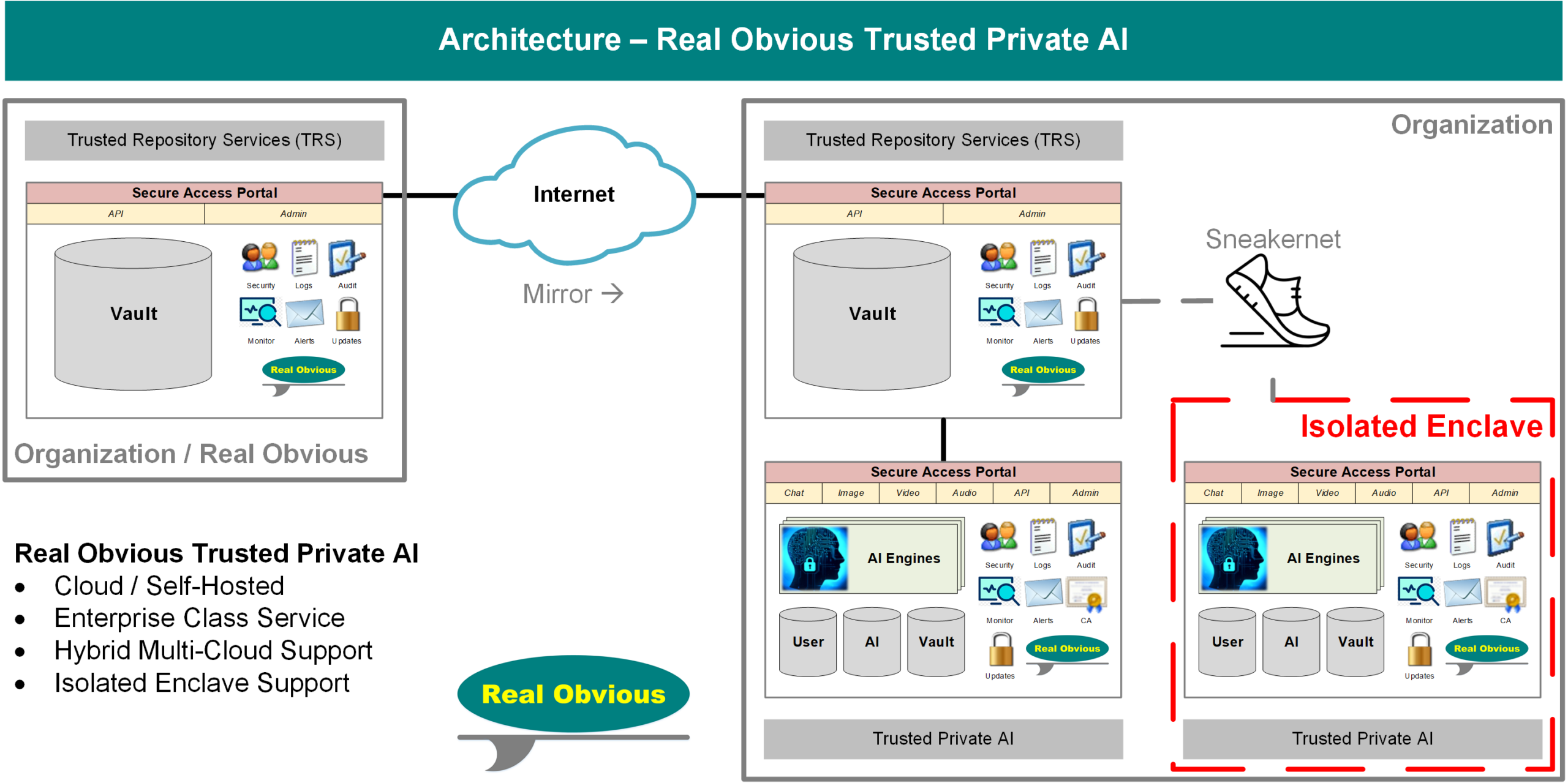 An isolated enclave Private AI system operates totally disconnected (air-gapped) from all outside networks. All software and data files (Certified Datasets) required to operate the system are replicated by an Internet connected Real Obvious Trusted Repository Services (TRS) then Sneakernet transferred to the isolated enclave system. Examples include dark sites, classified systems, and test systems.